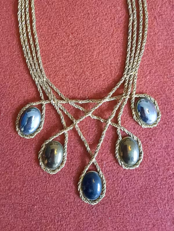 Necklace, very distinctive one-of-a-kind designer piece, gold-colored metal cords wrap around beautiful 3 cm pearls in the colors: black, dark blue and dark blue. Looks beautiful on the skin, on black, blue, gray or white clothing.